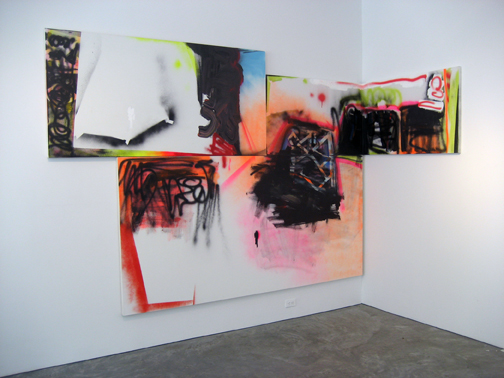 Back to Scrape, 2007, acrylic and spray paint on three canvases, 82 1/2 x 115 x 44 inches