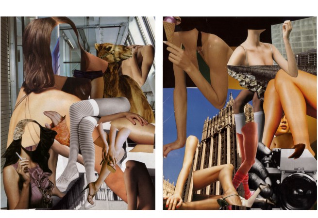 | It is estimated we see 3,000 ads per day. Fashion and sex are two main selling points and are used nonstop to convince us to buy products we can do without. – The collages are abstractions, separating the projected image of the product from the material being sold. The concentration of images multiplies the potency while removing unnecessary images (ie. the products and identities of spokespeople). | ||||