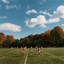 | | | Cheerleaders.Diversity in uniformity is what fascinated Finke about his chosen subject: cheerleading competitions, photographed in New York City, Pennsylvania and Florida. He followed competitors from 175 schools all over the US, witnessing moments of emotion as they practiced, prayed and cried. In order to reveal the girls’ identity he focused on their subtle expressions and gestures. While every cheerleader is created in the image of the team to perform and look the same, these girls are also teenagers addressing such issues as social behavior and sexuality. ‘In my Photos,‘ says Finke, ‘these teens struggle between being part of a group and defining themselves.’ |