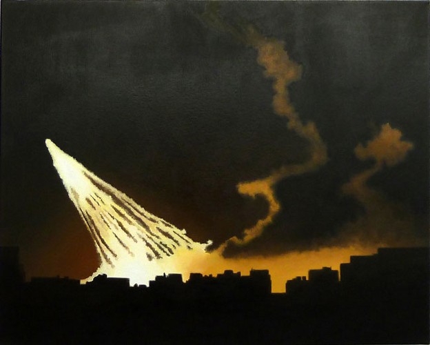 By broadening color range and surface/paint textures, I draw attention to the idea of surfaces and representation–what is real, what is made up, and specifically how can a painting ‘accurately’ deal with issues of conflict, violence and death, if at all? Paint’s myriad formal qualities have the power to engross and/or distract a viewer, and I choose to make paintings about conflict that exhibit some internal struggle of their own. In my work, imagery often vies with formal aspects for the viewer’s attention, mirroring the inherent conflict between an artwork’s subject matter and its representation. In this way I bring the idea of focus–mine, the viewer’s, this country’s–into question, as I continue to explore the role and act of painting as a way to engage with current events.