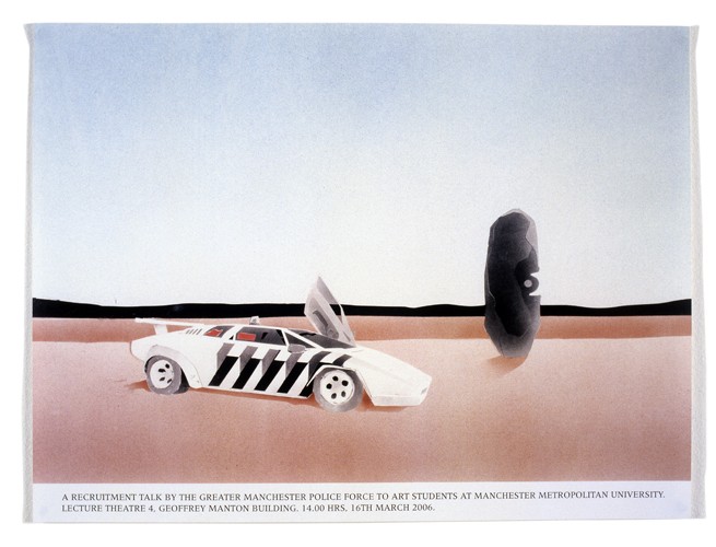 Thirty posters (63 × 48 cm) are silk-screened – of which twenty are displayed at the art school – announcing “a recruitment talk by the greater manchester police force to art students at manchester university”, or applicable local phrasing. The poster depicts a landscape with what could be described as a rock or a sculpture, with a stationary Lamborghini Countach (painted in the livery of the Dutch police force).