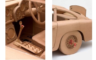For Chris Gilmour’s first New York solo exhibition “Pussy Galore”,October 19 – November 22, 2006, Freight + Volume exhibited a life-size Aston Martin DB8, rendered in cardboard to such precision that even the most insignificant details of the engine are visible. The sculptural model pleads for reaction or interaction, coaxing the audience to hop into the driver's seat and take a spin, a la James Bond’s Pussy Galore. The automobile is presented, stripped of material constraints, as Gilmour’s latest sculptural accomplishment with steering wheel, gears, and tire spokes all in tow. Gilmour also presents, as part of his newest body of work, a series of acoustic and electric guitars as well as miniature churches modeled out of cigarette and condom boxes, again juxtaposing fiction and reality in playful jest.