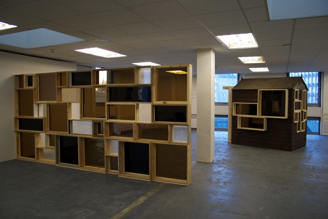 The Shodhan-Screen is derived from a window in the House. In IR11 it retains a trace of this function by its attachment to the wall at one end. It partially divides the room, interfering a little with the existing architecture, its cubic modularity relating gently to the grid-like quality of the suspended ceiling.