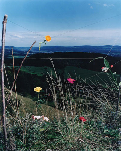 There’s something illicit about the “Blumen” photos, a literal trespassing. In order to get the flowers, I have to go into strangers’ gardens and yards to steal them. Then I have to go someplace that’s not my place and build this thing; within minutes, the flowers begin to wilt, changing shape and color. And inevitably, the wind blows them down. It takes about six minutes to construct a structure. It’s the perfect illustration of the term deracinated. I like that about it, the clarity of its purpose. It’s the opposite of arranging a still life in a studio with a table—and unlimited time. Here, you tie a flower to two or three sticks and hope it stays up. After I take the picture, I take a step back and look at this little theater or shrine to nothing that I’ve built and then tear it down. The picture is a document of a public sculpture or an act of vandalism.