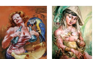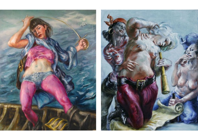 | “My subject is a fantasy of a sexual identity in the make-believe life of a pirate. The theme came to me as a contradiction while reading bedtime stories to my son. Pirates represent freedom, the power to act out our impulses, and serve as a pervasive icon in our culture. However, the image my son carries of the pirate’s life is empowering. In marrying this ideal with a burlesque humor and Disney-like fantasy, the combination is alternately teasing, provocative, tender, and inviting. | ||||