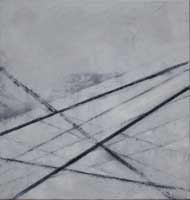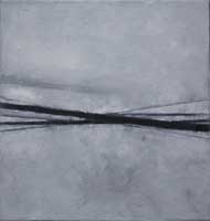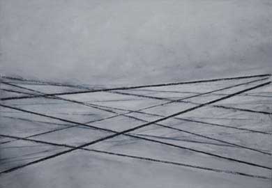 I am interested in the point at which painting and drawing meet. Canvas suggests painting. The 'Journey Sequence Paintings and Circular Walk Drawings' made between 2005 – 2009 address the issue of the nature of drawing and consider the moment when a drawing stops being about drawing and starts being about painting. In my current work I take these ideas further with insistent repetitive, destabilised charcoal lines slashing across the surface of painted canvas. They are undoubtedly paintings. The deliberately painterly use of paint which contributes to the sense of instability, creates a surface which makes them paintings rather than drawings. However they retain a significant element of drawing.