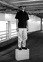 | << The image to the left is from the Commutes: MTA series. It is documentation of a performance enacted in the 42nd Street/Times Square subway station. I constructed a special attaché to carry on my daily commute. It's dimentions are based on the difference betwen my body and a peculiar hole in the ceiling. When I reach the site, I place the ataché beneath the hole and step up, inserting my body betwen the ataché and the ceiling, with my head in the depth of the hole. I pause here for a few moments, allowing this landmark a place on my personal itinerary, then I move on. . . | ||||||||