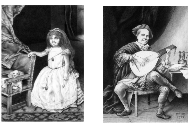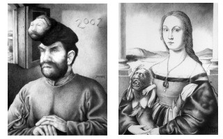 | My on-going series of drawings called Prodigies features portraits of 'anomalous humans' – sometimes called ‘monstrosities’ or ‘freaks’ – in contexts borrowed from artworks of centuries past. In the spirit of the circus or carnival sideshow, where even a three-legged man would be re-invented to appear more interesting, I have created new 'histories' for my subjects in which fact and fancy are liberally mingled. The resulting images confront the viewer with something that at once seems familiar, humorous and startling. | ||||