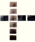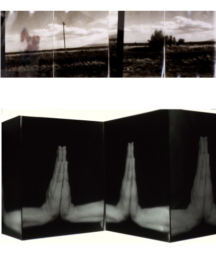 landscape around us. I locate memory in the corporal body, where it has both a mental and physical dimension. I extend it out from there to create a map, a series of correlations between thought and the physical world. In this work, corporal bodies as well as the landscape of nature (trees, sky, rocks) act as supplementary wards of our memory. – Through the repetition of images in photographs (clasped hands, breaking waves, parsed guard-rails, saltbox houses) and the overlapping of materials (on paper, metal, glue) a central image is often rendered blurry or contextually unfamiliar, to mirror the way memories are often found and seen. This, along with the fact that the works are often all constructed of numerous small parts, is an attempt to invoke the layered strata of remembering. Black and white photographs are made three-dimensional with accordion folds, rocks are trapped precariously on wires, lucite boxes become cages for water. All are pieced together with intentionally visible seams, and the viewer is given an exposed reconstruction of traveling. The traveling one does in recollection. While each piece predictably varies in medium and size, each is also of deliberately different weight, reflecting the varying weights memories carry. Inviting the viewer to become part of my memory recollected, I give physical landmarks their own symbols and language. Trees become thought, oceans become breath, deserts become a substitute for skin.