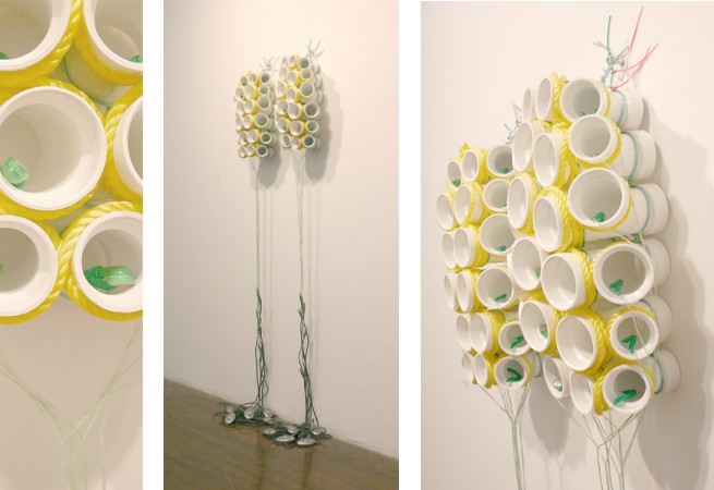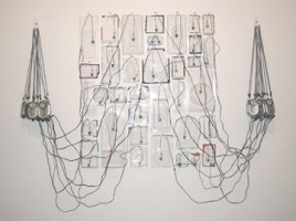 | These images are from ‘Pedestrian’, an exhibition at the Bronx River Art Center in 2004. Above: Outerspeak, 2003. PVC pipe, rope, headphones, wire, and radios tuned to different AM stations. Below: Innerspeak, 2003. Plastic packaging, headphones, pins, and radios tuned to different FM stations. | ||||