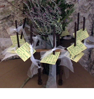 | "The Vessel", a fragile wire structure present in some of my previous projects, here it becomes much larger (15 feet), naked as bones, a transparency and a gesture. It is a large perforated skin, slicing space and accessible to be entered and "navigated". "The Invaders" flanked the diagonal "Vessel", coiled and meandered through the sloping space as intruders or conduits to other spaces as they penetrated through the holes in the walls . Various ladders, clumsy, oddly assembled and with crooked steps, clinging to the thick ruined walls, leading towards the deep blue sky. Ruins visible everywhere in the form of burned, rusted, twisted, discarded mechanisms and fortress like stone walls now broken and exposed. Residuum of power climbing upwards penetrating the open sky. All traces of intense and hard labor as well as violence and death. In the "studio" a heavy iron gear mechanism traversed the space high at the top. There I hung the two upside-down trees used as writing surfaces for the poems and names of the victims of the last explosion. Visitors also wrote notes and made drawings on the leaves, that as they dried, would fall to the ground. The small niche carved into the right wall became "The Altar". In it fresh herbs: incense, rosemary, thyme, sage, lavender, and oregano. White veil bows held the delicate flowering herbs. The base of this "Altar" was covered with broken glass from beer bottles found in surrounding gardens of the Studios/Steam Shops. | |||||||||