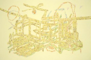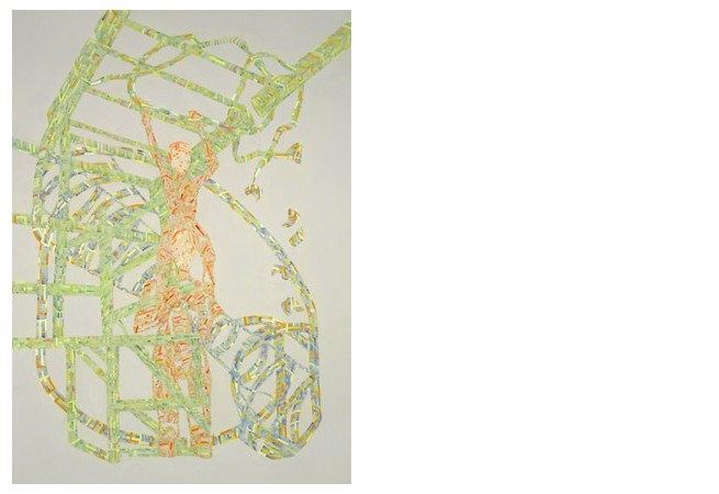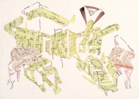 Images : Julian Pozzi, Father and Son, 2007, ink, watercolor, acrylic and gouache on paper, 55 x 38 inches Julian Pozzi, Apartment, 2007, ink, watercolor, acrylic and gouache on paper, 38 x 55 inches Julian Pozzi, Untitled (1045), 2004, ink and watercolor and photo transfer on paper, 12 x 16 3/4 inches | Julian Pozzi's paintings on paper weave architecture, bodies and landscape into intricately gridded and ghostly structures. Buildings and bodies are wildly improvised, treating space and the human form as both formal and concrete possibilities. In both large and small scale works, space contracts, envelops, and flattens out – playfully and sometimes implausibly. Through hot and cool colors, varied mark marking and line, Pozzi's work suggests multiple readings and vantage points within each piece, offering the viewer different and transitory interpretations of apprehended space. His process of thoughtful wavering between fidelity and improvisation yields transformations from exterior to interior, and from architectural to organic. This is Julian Pozzi's second exhibition with the gallery. His work has been exhibited at White Columns, New York; Atelier Cardenas Bellanger, Paris; Golinko Kordansky Gallery, Los Angeles; and most recently at Public Storage/Temple Hospital, a screening of videos organized by John Pearson at Mandrake in Los Angeles. He lives and works in New York.
