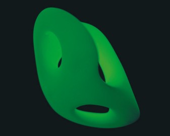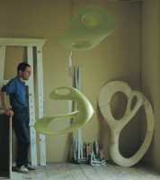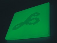 This contradiction is defined even more precisely in the application of phosphorescent glow paint, so that the objects are shining diaphanously out of the dark. Each sculpture is suspended from one point, by which the impression produced is that of shapes floating freely in space, their radiant light slowly fading. Comparable to an anachronism, a time-shifted reflection of the light that struck earlier is produced, a kind of �delayed light�. From the real- time experience of the world, which assumes spatial proximity, an optical sculpture is created by the afterglow, which even from a distance allows us to absorb actual events, time-shifted and in slow motion, without the filter of electronic media. Surprisingly, recent research brought to light results as follows: Taking a big step in manipulating light, physicist Lene Hau of Harvard University used a superchilled gas to stop a laser beam travelling � like all light � at 186.282 miles a second�. 1. NATIONAL GEOGRAPHIC, Oct. 2001, page 10