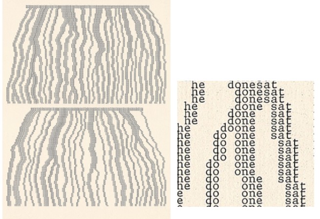 3. | At first glance, Etheredge's work is minimal, almost stark, diametrically opposed to the flourishes of nineteenth century eulogy. His patterned fields of type on paper evoke the visual formulae of information culture-streaming data, wave-form graphs, fields of dense and not immediately decipherable code. Even the color photographs of landscape are framed by and subordinated to type. In his choice of these parameters-black letters and white space, arranged via carefully planned and precisely executed operations-Etheredge engages premises derived from conceptualism, in which the meaning of representation is constantly interrogated and mark-making rigorously schematized. The artist's background as a scientist-he holds a B.A. in zoology as well as an M.D.-undergirds these interests, stimulating his preoccupation with systemic functions, his patient tracking of a given hypothesis through all possible permutations. Rules, or what Etheredge calls 'simple relationships between foci,' become both the medium and message, arising in the artist's mind as random propositions, inscribing themselves on paper as clean, undeviating visual flow. - extract from essay by Frances Richard (2002)