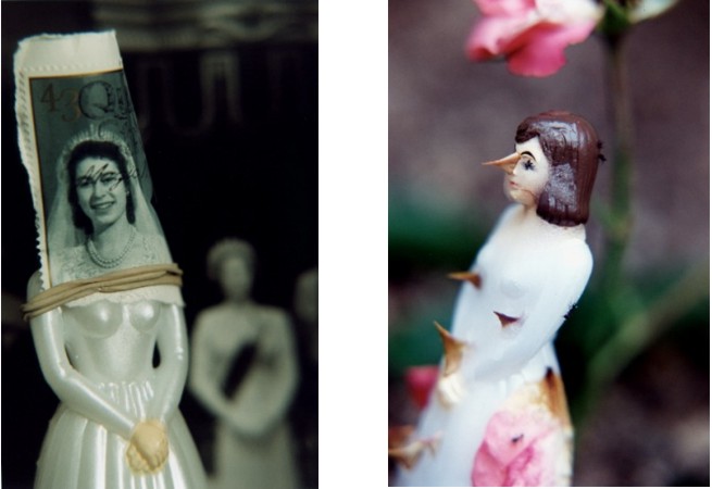 Interchangeable Disturbance (ID) consists of 50 color photographs centered on desires and fantasies of a wedding cake figurine. Her magical transforming energy seems to come from her dissatisfaction with her identity as a determined object. This murky scenario suggests phenomena which shifting surface identity produces an ambivalent presence. While she is simulating magical effects on her surface, she is gradually trapped between reality and ideality. As a result, a mixture of pleasure and disturbance comes to her at the same time. Her never-ending exploration into her identity adds more and more personas to her surface, yet, ironically, her new personas persistently keep her on the wedding cake.
