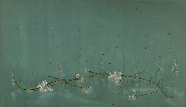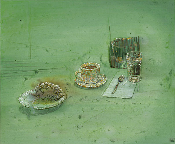 Raedecker practices an unusual kind of alchemy. He combines thread and paint to form shadowy netherworlds, steeped in atmosphere. Painted in glacial tones, his images have the leached-out quality of remembered dreams; their embroidered descriptions niggling the surfaces of the canvases like details that are stuck in one�s memory. Raedecker�s works are never innocent. They steal from such disparate sources as Dutch still life painting, photographs of modernist architecture, B-movie scenes and antiquated gardening catalogues to create a pictorial language that is both deeply original and disturbingly familiar.