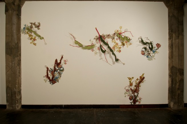 Images 1-5 "How Does Your Garden Grow," part of Motifs: invited solo exhibition for InLiquid at the Crane Hall, Philadelphia, 2011 Wallpaper cutouts, altered tree branches, fringe, porcelain objects 120" H x 192" W