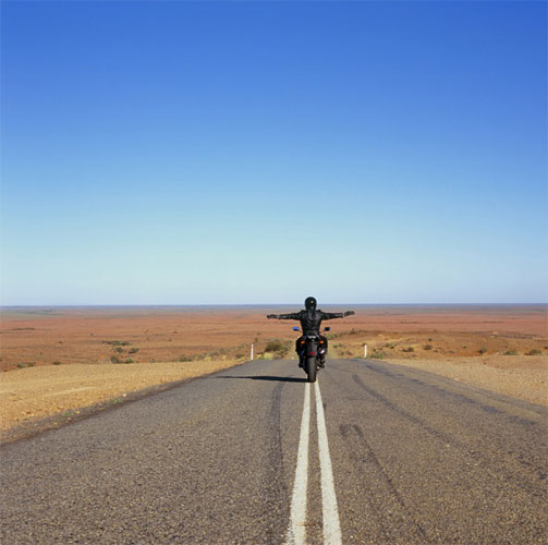 Clad in black jeans, leather jacket and helmet and viewed always from behind, the motorcycle rider is ever in motion away from us. He remains anonymous no matter how long we spend in front of the screen. The camera keeps a consistent tracking distance as the rider descends the outback highway, the slow-motion scrolling of the white road lines through the frame evoking a multitude of references from popular cinema, music and literature. The rider’s arms are outstretched, parallel to the horizon line that splits the video frame, a line formed where sky – on occasion vivid blue, other times tinged pink at dawn – meets the burnt red and grey mulga and saltbush scrubland of the plains stretched out before him, evoking the high horizon line used by twentieth-century Australian painters Sidney Nolan and in more pronounced manner Fred Williams to picture the vertiginous experience of encounter with such vast spaces. Not unsurprisingly, given the quality of his own painting practice, Shaun Gladwell always carefully attends to formal composition within the picture plane, as well as to the representational history of such composition.
