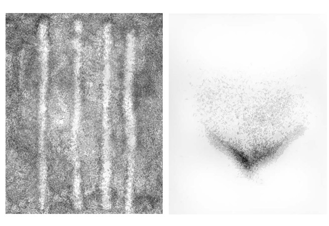 Mutations, 2003 - Electroportation, a phenomenon in which the membranes of a host cell are exposed to high intensity electric field pulses, temporarily shocks or destabilizes the cell making it highly permeable to other genetic material. A donor gene's DNA is then injected into the cell where it migrates to the chromosome and becomes incorporated into host's DNA. After the initial charge and injection the cell membrane reforms. Newly altered cells are then placed in a culture enabling them to produce the unique cell types that compose the transgenic organism. The resulting cells are then transferred to a growth environment where the incorporated gene can thrive and reproduce. | Rice is eaten by 3 billion people every day. Ten agricultural conglomerates control 40% of the world's rice seed market. The varieties of seed and how they are produced is increasingly dictated by a few multinationals. Some producing nations cannot afford to buy their own crops and are selling them to the nations providing the seeds. Often the company manufacturing and selling the seed is also manufacturing and selling the weed-killer that the seed is resistant to. When genetically modified material is introduced into the natural environment it can propagate to un-modified, closely related species. Viruses in transgenic crops are able to recombine genetic material and pass new susceptibility to previously established rice strains. An epidemic of blight could sweep across Asia and Africa, creating a famine of unknown proportions. - When these rice drawings were made, the U. S. Federal Drug Administration had continued its refusal to approve the labeling of genetically modified foods. I do not know if the rice used in my drawings was genetically modified.