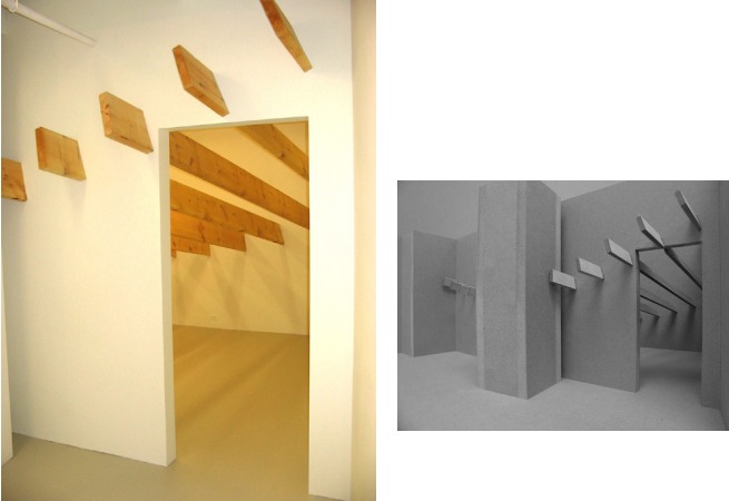 Generated via catenaries, the precise curves of the beams (which break through interior and exterior walls of the gallery to revel both factory-cut ends in places, as well as crudely sawed-off ends in others) are the result of Lendvai�s application of construction technology that pre-dates computers by millennia. Further, whereas a sub-theme of �A Series of �Nows�� was its implication of infinity, this new installation unequivocally and unceremoniously comes to an end.