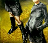 | In his paintings and drawings, Martinez captures the alienation of city life. Anger, loneliness, desire, rage, frustration haunt barren cityscapes in the form of totemic signs and symbols drawn from his urban environment. His images--drawn and painted with a skill rarely seen in contemporary art--are graffiti gang tags, ragged flaming Sacred Hearts, machine gun-toting fashionistas, demonic robot rabbits--the stuff of dead-end streets, abandoned warehouses, Botanicas, old comic books and magazines, faded tattoos and scarred skateboards. They are like a frame of double-exposed movie film, moments of absolute stillness and quiet, the city and its swirling chaos frozen for a moment, absolutely quiet, like the quiet of a coming storm. -Susanne Reece |