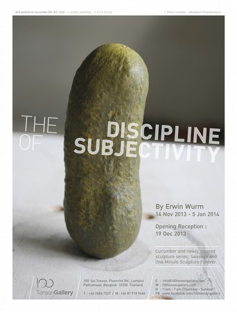 | The Discipline of Subjectivity Erwin Wurm 100 Tonson Gallery has been representing contemporary Thai artists in both Thailand and around the world for a decade; in addition, the Gallery has continuously brought international artists to our premier Bangkok platform, among them Yayoi Kusama, Damien Hirst, Yoshihiro Suda, and—upcoming—Erwin Wurm, one of the most globally celebrated contemporary artists of our day. In November this year, we proudly present The Discipline of Subjectivity, the first solo exhibition in Southeast Asia by Erwin Wurm. This exhibition comprises three series of Wurm’s work as part of One Minute Sculpture Forever, a development of his well-known One Minute Sculpture series which is created on the occasion of 10th Anniversary of 100 Tonson Gallery, Cucumber, one of Wurm’s best known series and Sausage, a new series which will be first launched here. The show is curated by Jakraphun Thanateeranon. The Discipline of Subjectivity exhibition will be on view from 14 November 2013 – 5 January 2014. The opening reception will be on Thursday, 19 December 2013, at 7 pm. For more information: 02-6841527, 084-3881488 or [email protected], [email protected] Facebook: www.facebook.com/100TonsonGallery | ||||