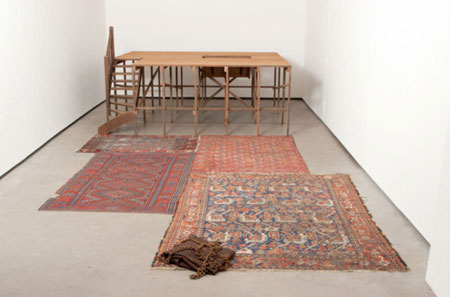 | The Art of Climbing Mountains 29 June 2011 to 29 July 2011 Cevdet Erek Adrian Ghenie Adriana Lara Mike Nelson Joel Shapiro 303 Gallery presents "The Art of Climbing Mountains," a group exhibition inspired by an excerpt of René Daumal's " Mount Analogue" published in 1952. The works in this exhibition investigate a variety of positions and possibilities addressing the challenges of life and the way in which one addresses these challenges - surreal, metaphorical and otherwise. Daumal, the French Surrealist writer, was known for his allegorical novels and translations of sacred Buddhist texts. "Shading Monument for an Artist," 2001-2011, by Cevdet Erek, works with migratory nature of the contemporary art community that moves individuals away from their homes in order to participate. Erek's sculpture comes out of the wall and functions as an awning. The awning is cut in a way that its shade reads as an adapted text from monuments for International Brigades of the Spanish Civil War built around Europe. IN HONOR OF COUNTLESS PEOPLE , WHO LEFT THEIR HOMELANDS TO , CREATE FREELY IN THE HEROIC , STRUGGLE FOR ART. MANY FELT , ALONE, ISOLATED AND LIKE LOSERS. , BUT NEVER SURRENDERED. THEIR EXAMPLE INSPIRED THE WORLD. "Triptych" (2010) by Mike Nelson, who represents Britain in the 54th Venice Biennial this year, is a wooden platform with a small set of stairs and a trap door. It is preceded by several oriental carpets and a pile of rusted chains. This work functions at once as a stage, the platform of a gallows, and a preacher's podium - diverse possibilities that can potentially co-exist in one mind. Joel Shapiro's formal experimentation walks the line between abstraction, representation, and utility, its purposeful ambiguity a window onto the viewer's expectation and perception. A new painting by Adrian Ghenie, characteristic of his practice, borrows from art & cinema history to create a suggestive imaginary that is cryptic, yet disarmingly familiar. Adriana Lara's set of five constructions, "23690," part of an ongoing series, takes photographic exposures of common every day objects in her studio that have been scanned. The image includes the scanner bed, another found object. Lara modifies her wooden frames so that they both contain the work as well as transfer additional information in the representation of numbers. Each "number" can be arranged in any order each time it is installed - which effects the overall five digit number, altering the final reading. Our interaction with the possibilities presented creates different outcomes. Special Thanks to House of Gaga, Mexico City; Fernando Mesta; Pace Gallery, New York; La Capela, Barcelona; SALT, Istanbul; Ivy Shapiro.303 Gallery represents the work of Doug Aitken, Laylah Ali, Valentin Carron, Anne Chu, Inka Essenhigh, Hans-Peter Feldmann, Ceal Floyer, Karel Funk, Maureen Gallace, Tim Gardner, Dominique Gonzalez-Foerster, Rodney Graham, Mary Heilmann, Jeppe Hein, Karen Kilimnik, Florian Maier-Aichen, Nick Mauss, Mike Nelson, Kristin Oppenheim, Djordje Ozbolt, Eva Rothschild, Collier Schorr, Stephen Shore, Sue Williams, and Jane and Louise Wilson. For further information please visit us at www.303gallery.com or contact Lisa Spellman, Mari Spirito, Barbara Corti or Cristian Alexa. | ||||