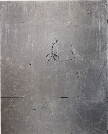 Nick Mauss, silent adjustments, 2009 Silver leaf and acrylic on panel 19 3/4 x 15 3/4 inches | |||