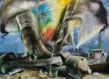 | Nigel Cooke March 31 - May 12, 2012 opening reception: Friday, March 30, 6:00-8:00pm Andrea Rosen Gallery is delighted to present our fourth solo exhibition of Nigel Cooke's work featuring seven new, large-scale paintings. In these new works, both the pictorial landscape and the surface of the painting become charged grounds for negotiation, where the suspicion of the image itself is actually the critical function of the picture. In a fugue of abstraction and representation, depth and surface, micro and macro, the remarkable slippage between gestural waves of paint and fantastically rendered figures, creatures and objects, these epically scaled paintings evolve Cooke's fundamental interest in the theory and practice of painting to a compelling hybrid state of generation and destruction. The impact of Cooke's exceptional fluency with paint is -as always- immediate, but perhaps what is most remarkable is how with each body of work Cooke radically pushes the boundaries of painting and our historically loaded expectations of painting, by both setting up and undermining these expectations. Abstraction and representation vie for primacy, each ultimately failing and succeeding in turns. As Cooke describes, "In multiple cycles of destruction and renewal, the wave storms crash into the imagery and wipe it out, leaving me the task of rebuilding the picture." Through this intrepid process of addition, subtraction and obliteration, each painting holds its own specific tension, and reflects the risk of being pushed to the brink of destruction or failure. A particular historical springboard for these new works was de Kooning's assertion that a successful painting had "no holidays" or caesuras- places where the painting was allowed to rest or to breathe. Digesting this in the studio, Cooke made one of the first paintings from this body of work "No Holidays," in which the space is entirely sucked up by paint, where each mark quite literally becomes both a support and a threat to the pictorial space. Even the hapless vacationers who inhabit the pictorial plane are part of this ambivalence, asserting their sovereignty while on the brink of being washed away. Acknowledging the velocity of painting, the vitality of the impact of the paint itself and the perverse psychology of the strokes that make it, Cooke's paintings deliriously push and pull us from layers of depth and detail to extreme surfaces of impasto. Despite the emphasis on the abstract, nevertheless, we are always returned to the inner workings of the characters that inhabit the picture- the lovers, holiday makers, sailors, sirens, clowns, chefs, half-wits and smoking flower people. There is a fascinatingly unique temporality and often seemingly blasé self-possession in each subject and object that survives the storm. The complexity of the layering of subject, narrative and the psychology of abstraction allows for an unusually protracted experience of each work, and seems to open a new chapter of painting. As Cooke puts it, "When does meaning get into the picture and convert the struggle into a second picture, outside of the mere paint, drawing the mind into a story, a setting, a drama? Why can't abstraction happen? And why, simultaneously, is it always already there?" In conjunction with the show, we are delighted to announce the publication of a book of Nigel Cooke's writings, Words, which includes an edit of his PhD Thesis, The Ambivalence of the Undead, or the Nature of Painting's Essence, as well as a selection of shorter works originally published in Tate Etc., Art Review, Turps Banana, Transmission Annual—Hospitality, and in a publication on Ansel Krut Nigel Cooke has exhibited at a wide range of international institutions, including a recent solo exhibition at the Goss Michael Foundation in Dallas Texas, and forthcoming solo exhibitions at the Arthena Foundation, Dusseldorf and at the Douglas Hyde Gallery, Dublin. He has had solo exhibitions at Moderna Museet, Stockholm in 2007; The Museum of Fort Worth, Fort Worth, TX and South London Gallery, London both in 2006, and Art Now, Tate Britain, London in 2004. His work belongs to several public collections, such as the Dallas Museum of Art, Dallas; Moderna Museet, Stockholm; Museum of Contemporary Art, Los Angeles; Museum of Modern Art, New York; Solomon R. Guggenheim Museum, New York; Tate, London, and the UCLA Hammer Museum, Los Angeles. Cooke received a PhD in Fine Art from Goldsmith's College, London and an MA in Fine Art from the Royal College of Art, London. Cooke lives and works in Kent, England. For images and press information please contact Jessica Eckert at [email protected] | ||||