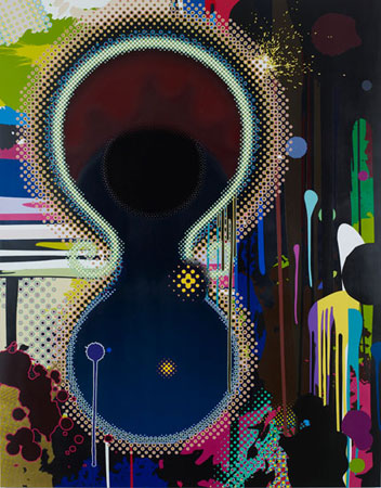 | Takashi Murakami Davy Jones� Tear May 3 � June 14, 2008 Opening reception: Saturday, May 3, 2008 Blum & Poe is pleased to announce an exhibition of new paintings by the acclaimed artist Takashi Murakami. This marks Murakami�s fifth solo exhibition with Blum & Poe. In a sensational display of new paintings, Takashi Murakami presents three distinct series�Daruma portraits, Korin landscapes, and abstractions�each signaling a playful turn toward the optical and gestural. Each image is built up from an innumerable mosaic of digital fragments that result in a visual unity that complicates the boundary between visceral and virtual realms of perception. This technical strategy is part of the artist�s larger interest in the power of fantasy and deception rooted in special effects technologies developed by Industrial Light and Magic in George Lucas films and in integrating this genre into his own practice. Departing from the refined formalism of his previous work, the paintings combine a new lexicon of dramatic techniques ranging from sprayed ink blots, drips, Benday dots and thick calligraphic brush strokes with a brilliantly rich palette of pastels, deep hues and metallic leaf layers that entertain the eye�s movement along the surface. The works also contain the artist�s continued interest in the decorative aesthetics found in the 18th century Rimpa school and the dynamic affects of Zen ink paintings by Kyoto school Eccentric artists from the Edo period. Enhancing the direct relationship between calligraphy and abstraction, the three Daruma portraits depict the great 6th century sage who introduced Zen Buddhism, and are identified both in image and signature (Daruma daishi=Daruma the Great) writ large. In Release Chakra�s gate at this instant, the artist flattens Daruma�s corpulent head and eyes as a glowing red light emanates from his urna and two disciples loom in the background. The works pay homage to the 18th century Eccentric painter, Soga Shohaku whose two aliases (Kishinsai, Dasokuken) are marked above the artist�s name in the bottom right corner in each of the series. In contrast to the gestural dynamism of the Daruma portraits, the two Ogata Korin landscapes are appropriations of 18th century painter�s commissioned fan paintings in serial versions of platinum and gold. Murakami overlays Korin�s glistening ornate waves with his signature flowers adapted into voluminous chrysanthemums. Reflecting Murakami�s own interest in artistic identity and branding, these works are also signed with Korin�s two aliases, the honorable H�ky� and his product identity, Kansei printed inside a red seal. The three abstract paintings signal perhaps Murakami�s most radical departure, signaling a revived interest in the design patterns of graffiti, Op art, and special effects, through carefully studied compositions and balance of forms. Davy Jones� Tear is adapted from a heartfelt scene in the �Pirates of the Caribbean: Dead Man�s Chest� where the villain reveals his inner torment while playing the organ. The perceived expressivity in these works is obfuscated by gourd-shaped inkblots, and vibrant streams dripping as if from freshly sprayed graffiti. Remixing a line of artists ranging from Pollock, Lichtenstein, Kazuo Shiraga, Sigmar Polke to Terry Winters, this new group of works perform a powerful play between the spiritual and the synthetic. Takashi Murakami was born in 1962 in Tokyo, and received his BFA, MFA and PhD from the Tokyo National University of Fine Arts and Music. He founded the Hiropon factory in Tokyo in 1996, which later evolved into Kaikai Kiki Co., a large-scale art production and art management corporation. In addition to the production and marketing of Murakami�s work, Kaikai Kiki Co. functions as a supportive environment for the fostering of young Japanese artists. Murakami is also a curator, entrepreneur, and a critical observer of contemporary Japanese society. In 2000, he organized a paradigmatic exhibition of Japanese art titled Superflat, which traced the origins of contemporary Japanese visual pop culture to historical Japanese art. He has continued this work in subsequent exhibitions such as Coloriage (Fondation Cartier pour l�art Contemporain, Paris, 2002) and Little Boy: The Art of Japan�s Exploding Subcultures (Japan Society, New York, 2005). Murakami�s work has been shown extensively in group exhibitions around the world, and in one-person exhibitions at leading institutions such as Fondation Cartier pour l�art Contemporain, Paris and the Serpentine Gallery, London (2002); Museum of Contemporary Art, Tokyo (2001; Museum of Fine Arts, Boston (2001). The Brooklyn Museum of Art currently has on exhibit � MURAKAMI (April 5 � July 13, 2008), the most comprehensive retrospective to date of his work, this exhibition was organized by The Museum of Contemporary Art in Los Angeles, where it was recently on view. In conjunction with the Brooklyn Museum exhibition, his seminal sculpture Oval Buddha is on view at the 590 Sculpture Garden (April 5 � September 7, 2008) in Manhattan. Because of its enormous scale, it was not possible for the 6,613 pound, 18 1/2 foot-tall sculpture to be included in the Brooklyn exhibition, but arrangements were made for the 590 Sculpture Garden presentation to coincide with the survey exhibition. � MURAKAMI will travel to the Museum f�r Moderne Kunst, Frankfurt (October 27, 2008-January 4, 2009) and the Guggenheim Museum, Bilbao (February-May 2009). | ||||