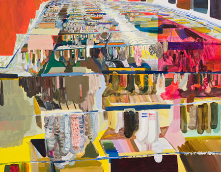 | LISA SANDITZ: Sock City October 23rd - November 29th, 2008 Opening reception: Thurs Oct 23rd 6-8pm Lisa Sanditz� third solo exhibition at CRG is the culmination of her interest and travels in recent years that have resulted in a new body of work inspired by the Chinese commercial landscape. The exhibition includes works on canvas and paper and is accompanied by a catalog with essays by Jonathan Franzen and Barbara Pollack that documents the entirety of her work on the subject. For the last ten years, Sanditz' paintings have focused on the various forms in which the marketplace and wilderness intersect, overlap, and inform each other. Subjects in her paintings have included such things as sporting events, shopping malls, residential development and tourist destinations. Through a complexity of combined forms, unconventional approaches clashing with more historically-anchored painting techniques, Sanditz has described the brash and metastasizing flux of the American landscape. Through her continued investigation of these places came an awareness of multinational corporations and sprawling urban and exurban areas not just in America, but all over the world. With a growing interest in the broader notion of the American landscape, it became clear that all the familiar commodities that we buy on a daily basis, everything from toothbrushes to cars, have their roots in distant and unfamiliar places, �places that we have unknowingly given birth to in our unsurpassed ability as Americans to consume. In the winter of 2006-2007 Sanditz traveled to single-industry towns in China; places whose industry is focused on the production of specific and often singular products. These places, located largely in China's Pearl River Delta have been unofficially renamed by the items they produce: Sock City (Yiwu), Shoe City (Jinjiang), Oil Painting Village (Shenzhen) are just a few among many others. These burgeoning micro-economies dedicated to producing fantastic amounts of a single commercial product for export have dramatically transformed the Chinese landscape; furiously shifting the pastoral to the industrial. Sanditz describes these places in her signature amalgam of fancifully ornate and pictorially bound marks; forming seemingly endless seas of product showrooms, factories, and neon signs that emerge from the murky smog saturated backgrounds of her canvas. For Sanditz this body of work evidences not a cultural divide but rather a convergence of two cultures economically. Perhaps not a symbiosis, but an awareness of how intrinsically linked and mutually impacting each has been and continues to be. Sanditz plans to return to China this winter to further investigate this relationship with the generous assistance of a Guggenheim Fellowship that she received in 2008. Next Exhibition: O Zhang "The World is Yours (But Also Ours)" Dec 12, 2008 - Jan 31, 2009 | ||||