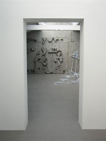 | Mick Peter The Nose: Epilogue Private View Friday 18th June 2010, 6.30-9pm 19th June- 25th July, Friday-Sunday 12-6pm or by appointment Mick Peter's work is derived from his interest in monumental sculpture and emblems of stupidity, producing objects with athromorphist personalities as scratchy paradoxes in lumpen matter. Using the traditional techniques of a sculptor Peter cuts, carves and hollows out material, but disrupts the integrity of this formalist process by coating the surfaces with cement or pigmented latex to create a more illusionary quasi-painted appearance. This appearance alludes to Peter's interest in drawing, and illustration, taking inspiration from the homogenous and anti-realistic colour processes of the 'comix' phenomenon of the 60s and 70s, but also ties in with the old fashioned ideals of early abstract modernist sculptors. His more recent sculpture draws from a broad catalogue of literary and theoretical references transposing the incongruity and strangeness of politically charged narratives. For his solo exhibition at Cell Project Space Peter will present a new version of The Nose, an installation project made for 'La Salle de Bains', Lyon earlier this year. Using the 19th century writer Nikolai Gogol's story of the same name and Dmitri Shostakovich's opera adaptation as emblems for the project the work explores the jarring absurdity of the former and the performance history and sceneography of the latter. The original story recounts an incident in which a Russian official wakes one morning to find that his nose is missing from his face; he later encounters the nose riding around St Petersburg in a carriage, dressed as a government official. While The Nose was regarded as a humorous but trivial anecdote for almost a century, later 20th century critics considered it to be a social satire on Russian culture, a Marxist critique of socioeconomic class, or a psychosexual fantasy, and a meta-narrative about the process of storytelling. In this ambitious floor to ceiling installation Peter integrates his anthromorphist treatment of human form into the schematic environment of the gallery itself. By combining a new cement wall relief with rubber objects the environment alludes to the cartoon-like aftermath of a rehearsal where music stands are left drooping towards the floor and The Nose has left the building. 'The Nose: Epilogue' is Mick Peter's first solo show in London since 'Fortescue Avenue/ Jonathan Viner' in 2007. Recent projects include The Changing Room Stirling, 'Dr Syntax versus the Paperweights' (2010), Galerie Cr�vecoeur, Paris, �The Lumber Room' (2009), Zoo Galerie, Nantes & Generator Projects, Dundee, 'Harmonielehre' (2009), CAPC, Bordeaux, 'Insiders - pratiques, usages, savoir-faire' (2009) and Muse� d'Art Contemporain Lyon, 'N'importe Quoi' (2009). Forthcoming projects include 'Le Vent des for�ts, France'. (July 2011), 'The British Art Show 7' (October 2010) and the 'Prix Ricard' (September 2010) Read Caroline Soyez-Petithomme's interview with Mick Peter in 'Zerodeux' Spring 2010 http://www.cellprojects.org/content/mick-peter-zerodeux | ||||
