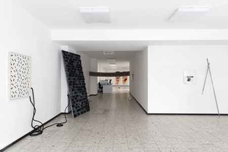 | KATHRYN ANDREWS STEPHANIE TAYLOR �your husband, your facehole� Er�ffnung: 16. Januar 2009 Ausstellung: 17. Januar bis 11. Februar 2009 And then you come with your sticks �CN Question: What connects a broom and a bottle of rum? Answer: a drunk janitor To husband is to join one thing to another, in a process which changes the meaning of both things. As with the Facehole at the county fair, where you place your face in the cut-out hole of a picture and thereby become part of that picture, Los Angeles artists Kathryn Andrews and Stephanie Taylor approach the structure of the two-person show--an event with inherent disconnections--as an affair to ask how do we make sense of what is seemingly incongruous? Andrews and Taylor work to make connections between artworks in differing ways, husbanding one thing to another, anything to essentially any other. Their collaborative effort has generated mostly individual works including sculpture, painting and photography. Andrews often bases her connections in the visual world--how to connect a green graphic with a red rug, simply paint a stick red and green and place it near the graphic and the rug. CN: "And then you come with your sticks." Andrews examines material and motif in order to web a world of visual husbandry--and no detail is too slight for her humorously fine-toothed investigations. Her methods, which explore the possibility and impossibility of coupling, have generated a range of objects including rented paintings from a Hollywood prop house ["Frame (Frankie and Annette)"], a commissioned double of another prop suggesting a brick wall ["Bricks"], hand-painted, one-off silk-screens, and a partial recreation of one of Taylor's works ["Addendum"]. Taylor, on the other hand, uses rhyme to generate each individual work. Her working method involves breaking down found text into individual syllables and reforming the syllables into elaborate and absurd narratives. In addition, Taylor's works rhyme with the materials with which they are made. For instance, "Broom and Rum", a cast aluminum sculpture, sounds like "oom and um," (and is made of aluminum). Her contributions also include "Show Sow and Calf", a set of photographs (its sounds: o-o-af/photograph), and a drawing, "Snoring" (with the sounds "or-ing"/drawing), which attempts to unite the two using narrative. Question: what connects a broom and a bottle of rum? Answer: a drunk janitor. Taylor uses narratives such as this one about a drunk-janitor-cowboy to connect works which otherwise are not connected. Any two objects are enough to make some kind of story--but, in Taylor's case, it's the objects (and their sounds), which come first and the story, which follows. | ||||