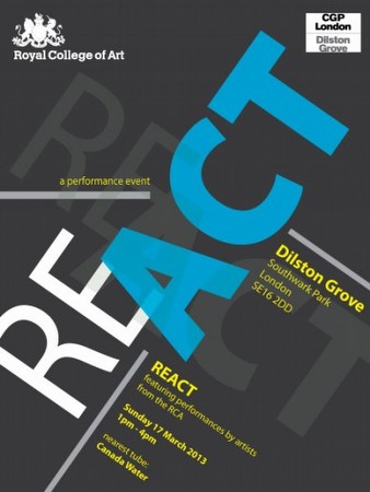 | REACT | Dilston Grove 17 Mar 2013 Performances by fine art students at the Royal College of Art. 17 March from 1 - 4pm. Dilston Grove Southwark Park London SE16 2DD Tel: +44 (0)20 7237 1230 E: [email protected] cafegalleryprojects.org | ||||
