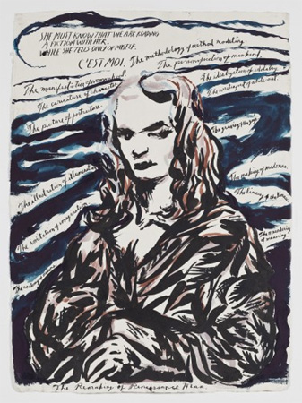 | RAYMOND PETTIBON Hard in the Paint November 6 � December 21, 2010 David Zwirner is pleased to present an exhibition of new works by Raymond Pettibon, on display at the gallery�s 533 West 19th Street space. Raymond Pettibon�s work embraces a wide spectrum of American �high� and �low� culture, from the deviations of marginal youth to art history, literature, sports, religion, politics, and sexuality. Taking their points of departure in the Southern California punk-rock culture of the late 1970s and 1980s and the �do-it-yourself� aesthetic of album-covers, comics, concert flyers, and fanzines that characterized the movement, his drawings have come to occupy their own genre of potent and dynamic artistic commentary. This exhibition takes its title from basketball terminology: used to describe a player moving within the rectangular and usually painted area below the net, �hard in the paint� indicates the difficulty in scoring from this angle amidst defensive pressure. In slang, it is also used to denote a confident, tough, or aggressive disposition, and as such, it is reflective of the directness of Pettibon�s work. Hard in the Paint presents a wide range of drawings unified by their bold, vivid lines and striking compositions. Fragments from American society have been singled out and distilled to key images, which often incorporate texts of varying length from one word to several paragraphs. The selection of texts, which over the course of Pettibon�s career have come to span a broad array of influences from popular media to Marcel Proust, William Faulkner, Henry James, Gustave Flaubert, and the Bible, relate both rhythmically and narratively to the visual content of his drawings, although their relationship may not always be immediately apparent. In keeping with Pettibon�s prolific practice, the works in this exhibition alternately address violence, humor, sex, evolution, and sports. In some drawings, the subject matter is immediately recognizable: No Title (For getting a�) depicts the moment a baseball player swings his bat; No Title (No time to�) shows a gunshot fired at a police officer. Other works combine a variety of references, some politically motivated. In No Title (Don�t ask! Don�t�), young men take off their clothes in a graveyard under the observation of a uniformed officer. As if commenting on recent American foreign policy, the Stars and Stripes motif is visible in the top left corner, and a text towards the bottom reads: �It would be like getting your own star engraved on some faraway sandy desert.� No Title (She must know�) portrays a young woman in a similar pose to Leonardo da Vinci�s Mona Lisa. In place of the winding paths and trees that make up the background of the iconic Renaissance painting, she is surrounded by ironic and contradictory art historical lingo, which is summarized by a sentence towards the top: �She must know that we are reading a fiction with her.� While there is always a narrative behind Pettibon�s work, punch-lines and single, intended meanings seldom surface. The artist�s use of language is more accurately a reaction and antidote to mainstream journalistic jargon�a unique form of contemporary image-infused poetry that drills deep into the American psyche. As more text has been incorporated into his drawings over the years, they have in turn become increasingly painterly and colorful. Drawing with an urgency rarely matched by his contemporaries, Pettibon continues a tradition of cultural commentary exemplified by artists such as Francisco Goya and Honor� Daumier in the late 18th and 19th centuries. His talented draftsmanship, combined convincingly with the cartoonlike, economical style of his representations, speaks swiftly and freely about contemporary culture. Since he emerged on the art scene in the 1980s, Pettibon�s work has been exhibited widely in the United States and internationally, including solo shows at the Renaissance Society at the University of Chicago in 1998 (the exhibition traveled to the Drawing Center, New York; the Philadelphia Museum of Art; and the Museum of Contemporary Art, Los Angeles); the Whitney Museum of American Art, New York, in 2005; and the Armory Center for the Arts, Pasadena, California, in 2009 (with Yoshua Okon). Pettibon participated in Documenta XI in Kassel in 2002 and in the Venice Biennale in 2007, and his works are included in important private and public collections worldwide. He lives and works in Venice Beach, California. | ||||