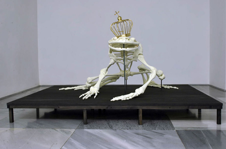 | BENE BERGADO Hom@ April 9th to May 22nd, 2010 Private View: Friday, April 9th, at 20:00 Hom@ is BENE BERGADO�s fourth exhibition at Espacio Minimo Gallery and is made up of five sculptural works with which the artist continues the work process she has been developing in the recent years. The museum taxonomies (from the Greek ταξις, taxis �ordering�, and νομος, nomos, �norm� or �rule�) understood as a system of classification with arbitrary conventions, are used by the artist to organize a series of bodies and open structures that include skeletons, cages, utensils, fragments of home interiors etc. The titles of three of the works in the exhibition make reference to three different types of �homo�: Homo Sentimentalis, Homo Capitalensis and Homo Sostenibilis. These are three of the many possible types of that could exist in a hypothetical museum of contemporary human beings. The work titled Homo Sentimentalis is based on the skeleton of a Goliath frog (the largest from in the world) up-scaled to a human dimension. It carries a crown which is a golden bronze cage, based on an earlier work from 2002. The work Homo Capitalensis is created from the thorax of a human skeleton melted into a hard pool with one of its shoulder blades sticking out of its spine, creating thus a the shape of a shark fin. Utensilios de Homo Sostenibilis is a work made up of a group of laquered bronze plates. Mirroring the visual style of traditional golden decorative friezes, these carry inscriptions of international symbols for toxic, radioactive and biological hazards. Each plate has bite marks where parts are missing. For it part Cabeza de Homo Sostenibilis seems materially similar to the previous work yet we find that inside, instead of bronze, we find it has been crafted with recycled plastic residues. The last works in the exhibition are Casa de Fieras and the first work in her new series Habitats Naturales which kicks off a new body of work. The work shows a section from a real home where the skeletal remains of a small humanoid being lie near a sealed trapdoor. The title makes reference to the 19th Century name for what are now our zoos. The starting points for each of these works are very different to each other. They emerge from desires, personal and formal interests. Many of the works have a slow production process which gices them time to contaminate each other. The museum system of clasification allows the artists to give the group of works a sense of order and reasoning. BENE BERGADO (Salamanca, 1963), graduated in Fine Art at Universidad del Pa�s Vasco. In 1987 she was awarded the Artistic Creation Scholarship form Diputaci�n Foral de Vizcaya and she was Professor at the Fine Art Department of the Universidad del Pa�s Vasco from 1987 to 1997. She currently live and works in Madrid. She has exhibited at international galleries and institutional spaces such as Sala Carlos III of the Universidad P�blica de Navarra in Pamplona, the Palacio de Abrantes de Salamanca or BILBAO Arte in Bilbao, and has taken part in important collective shows such as Muestra de Arte Joven (1992) at Museo Espa�ol de Arte Contempor�neo de Madrid, Distancia Cero (1994) at Centro de Arte Santa M�nica de Barcelona, Gure Artea (1996) at Sala Rekalde in Bilbao, Procesos (1997) Festival Internacional de Lima, Per�, Como nos vemos. Im�genes y arquetipos femeninos (1998) Centro Cultural Tecla Sala, Hospitalet (Barcelona), Trans Sexual Express (1999) BILBAO Arte, Bilbao, PASION. Dise�o espa�ol (2002), travelling echibition in Spain and Germany, Im�genes de mujer en la pl�stica espa�ola del siglo XX (2003) Museo Pablo Serrano, Zaragoza, Indisciplinados (2003) MARCO. Museo de arte contempor�neo de Vigo, Vete a tu habitaci�n (2003) Casa Encendida, Madrid, Contemporary Art. Castilla y Le�n (2005) White Box, New York, Dibujando al rev�s (2006) Centro Cultural Montehermoso de Vitoria, Para todos los p�blicos (2006) Sala Rekalde, Bilbao, Existencias (2007) MUSAC. Museo de arte contempor�neo de Castilla y Le�n, Le�n, INC�GNITAS. Cartograf�as del arte contempor�neo en Euskadi (2007) Museo Guggenheim, Bilbao, Supraficciones (2007) Fundaci�n Caixa, Lleida, Esculturismo (2008) Sala de la Comunidad de Madrid, Alcala 31, Madrid� Adem�s, ha participado en distintas ediciones de ferias internacionales de arte contempor�neo como ARCO (Madrid), FRIEZE ART FAIR (Londres), CIGE (Beijing), SHcontemporary (Shanghai), ART BASEL MIAMI BEACH (Miami), ART CHICAGO (Chicago), ARTISSIMA (Tur�n), ART FORUM BERLIN (Berl�n), ART BRUSSELS (Bruselas), THE GRAMERCY INTERNATIONAL CONTEMPORARY ART FAIR (New York, Los Angeles y Miami)� Her work is in the collections of, amongst others, Banco de Espa�a in Madrid, MUSAC (Museo de Arte Contempor�neo de Castilla y Le�n) in Le�n, Museo ARTIUM in Vitoria, Fundaci�n BILBAO Arte in Bilbao, Diputaci�n Foral de Vizcaya, Comunidad Aut�noma de Murcia, Instituto de la Juventud in Madrid, Consejo Superior de Deportes� BENE BERGADO Hom@ 09 Abr. 2010 / 15 May. 2010 Hom@ es la cuarta exposici�n individual de BENE BERGADO en la galer�a Espacio M�nimo y consta de 4 piezas escult�ricas con las que la artista contin�a el proceso de trabajo que viene desarrollando desde los �ltimos a�os. Las taxonom�as (del griego ταξις, taxis, "ordenamiento", y νομος, nomos, "norma" o "regla") muse�sticas, entendidas como un sistema de convenciones arbitrario de clasificaci�n, son utilizadas por la artista para organizar una serie de cuerpos y estructuras abiertas que van desde esqueletos, jaulas, utensilios, fragmentos de hogares etc. Los t�tulos de tres de las obras de la exposici�n hacen referencia a tres tipos distintos de �homo�, Homo Sentimentalis, Homo Capitalensis y Homo Sostenibilis, y son algunos de los muchos posibles a la hora de incluirlos en un hipot�tico panorama muse�stico del ser humano contempor