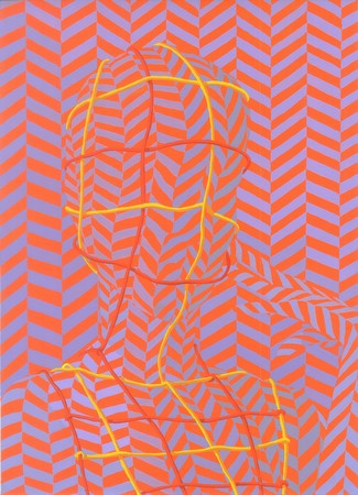 | SASCHA BRAUNIG WRISTER, BLISTER, PLASTER January 12 - February 15, 2013 Reception: Saturday, January 12, 3:00 PM - 5:00 PM Foxy Production is very pleased to announce - on its tenth anniversary - the re-opening of the gallery space and Sascha Braunig's solo exhibition Wrister, Blister, Plaster after the gallery's post-Sandy reconstruction. Braunig's exhibition originally opened in late October, just days before the hurricane hit. We are extremely grateful to the many individuals and organizations that have helped re-establish Foxy Production. We are also very happy to report that our neighbors on W 27 Street are re-opening on the same day. WRISTER, BLISTER, PLASTER is Sascha Braunig's second solo exhibition at Foxy Production. Unraveling the figure in unexpected ways, her new series of oil and gouache portraits employ both Op art and baroque elements. The exhibition comprises highly patterned figures who appear interwoven with their environments, and hybrid beings whose bodies and their ornamentation seem indivisible. Braunig’s geometric figures have a visual fluidity, as if their delicate skins can barely contain their bodies. Subject and background merge, creating ambiguity and optical tension. An alliance is forced between flat patterned designs and observed, mimetic representation. The artist’s alien figures refract studio portraiture into hallucinatory scenes. Mixing angst, elegance, and humor, Braunig appropriates the techniques of historical portrait painting. The works' ruffles, masks, hairstyles, and make-up push adornment into a parallel universe of body morphing and new life forms. Wrist Painter - a Greenberg-era term for someone who makes non-expressionist, easel-paintings - depicts an artist holding a maulstick, an aid to steady the hand and prevent it touching a painting’s surface. In this work Braunig honors traditional painting’s attention to detail and its illusionistic tropes. Prop, with its stalk holding up a horizontal figure’s head, is an ambivalent nod towards Dali. Maintaining a rigid, gravity-defying hairdo, the figure is held within an expanding series of diagonal lines. Like a chameleon, the figure takes on the same color and texture as its background, yet it remains in distinct relief from it. Bossy Pins channels classical portraiture into unknown territory, catching an uncanny figure performing a stylized gesture. The subject’s head resembles a mix of brain and hair framed by ornate ruffles. The figure is bathed in green and red lights that luridly intensify the scene’s sense of theatricality and artifice. Fister depicts a fur-coated figure with a brain-like head, an oddly rounded hairpiece, and hands tensed. For the artist, the exposed membrane alludes to the practice of trepanning, the drilling of a hole in the skull to relieve pressure or experience ecstasy. The painting relishes in its improbable yet thoroughly convincing contrasts between fantasy and the real. SASCHA BRAUNIG (Qualicum Beach, BC, Canada, 1983) currently lives and works in Portland, ME. She holds a BFA from Cooper Union, New York, and an MFA from Yale University. Selected exhibitions include: Baltimore Museum of Art; Algus Greenspon, New York (both upcoming, 2013); Bill Brady KC, Kansas City, MO (2012); Bridgehampton Biennial, NY; Simon Oldfield Gallery, London; Foxy Production, New York (solo) (all 2011); Everard Findlay, Brooklyn, NY (both 2010); ATM Gallery, New York; Philadelphia Institute for Advanced Study, Philadelphia (both 2009); Lower Manhattan Cultural Council, New York; John Connelly Presents, New York (both 2006); and The Infinite Fill Show, curated by Cory and Jamie Arcangel (2004). SASCHA BRAUNIG Gallery hours: Tuesday - Saturday, 11-6PM FOXY PRODUCTION 623 W 27 ST NYC 10001 t: +1 212 239 2758 f: +1 212 239 2759 | ||||