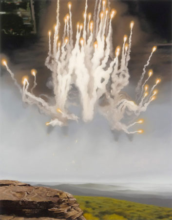 | JIMMY BAKER CIVIL DUSK October 17 - November 15, 2008 Opening reception: Friday, October 17, 6-8pm Hours: Tuesday to Saturday, 11-6 pm Civil Dusk, Jimmy Baker's second solo exhibition at Foxy Production, introduces a new series of intense and moody oil and resin paintings. In Civil Dusk � the period after the sun has edged below the horizon and objects are still distinguishable � Baker uses cloaks of fog, smoke, or dust, and disorienting inversions and combinations to make the known feel uncanny. Baker explores American landscape painting's myths of expansion and freedom, and its conjuring of sentiment and the sublime. He relates its strategies to those of the contemporary media, refracting scenes gleaned from television and the Internet through the lens of Romanticism. His new paintings exhibit a dramatic high gloss sheen that is at once seductive and distancing: they act as both screens and mirrors. As if situated within the eye of a storm, Baker's paintings bear a calm surface that is underscored by a sense of impending turmoil. The work Passing presents a vista of lake, mountain and sky that could be found as easily in the American West as the troubled ranges of Afghanistan; in View from CCTV, a vast mountain-scape is seen through the windows of what may be a military observation tower; and in Iron Mountain, the huge underground storage facility is depicted in deep reds and grays, eliciting senses of both safety and fear. Baker dramatizes the boundaries of representation, depicting unbounded visions tempered by a consciousness of spatial, existential and social limitation. Moving across continents and through clouds, Baker's perspectives blur definitions and ready identifications: a star atop a Stalinist tower's spire appears to float off into a turbulent foggy Moscow sky; a fiery, riotous Guy Fawkes celebration is captured in a dramatic palette of red, yellow and black; and a Middle Eastern palace appears through a miasma of dust. Baker creates a filter between viewer and scene that both romanticizes and disengages its subject, producing a profound sense of displacement. The works in Civil Dusk picture the impossible in the most credible ways. With bravura they play with the conventions of visual artifice in painting: above an expanse of blackness, lights reflect upon still water and night falls upon a mountain range; and a nighttime air attack appears inverted, above an outcrop in a wintry alpine terrain. Baker's paintings beguile with their suspension of the laws of perspective and gravity, seducing the viewer while laying bare the devices of traditional landscape painting. Civil Dusk marks the opening of Foxy Production's new gallery space at 623 West 27th Street in New York City. Selected exhibitions by Jimmy Baker include: Roberts & Tilton, LA (solo); New Galerie de France, Paris (solo) (both 2009); LISTE, Basel (solo); Weston Art Gallery, Cincinnati, Ohio (both 2008); Roberts and Tilton Gallery, LA (solo); Western Exhibitions, Chicago, IL (both 2007); Foxy Production, New York (solo) (2006); Weston-Bolling Gallery, Cincinnati, Ohio (solo) (2006); Publico, Cincinnati, Ohio; DePauw Biennial, Greencastle, IN; Black Floor Gallery, Philadelphia (all 2005); The Artery, Newport, KY (solo) (2003). --- SAVE THE DATE: Monday, October 20, 2008 at 7 pm AN EVENING WITH OLGA CHERNYSHEVA at MoMA Olga Chernysheva discusses her artistic practice in the context of Russia today, and shows several of her videos, including The Train (2003) and Untitled. After Sengai (2008). THEATER 2 THE MUSEUM OF MODERN ART 11 WEST 53 ST., NEW YORK NY 10019 Between 5th and 6th Avenues p: +1 212 708 9400 | ||||