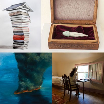| The Front Room is Proud to Present: Thomas Broadbent Sascha Mallon Karen Marston Miho Suzuki Montrose December 9-January 1 Opening Reception Friday December 9th, 7-9pm Hours Fri-Sun 1-6 and by appt. Front Room Gallery is proud to present, "Montrose" an exhibition of new works by: Thomas Broadbent, Sascha Mallon, Karen Marston and Miho Suzuki. Featuring artists who were selected to participate in the Montrose Farm Artist Residency, in historic Long Green Valley, Maryland. Invited artists were given two week residencies during June-July 2011 to develop and inspire new works the results of the residency will be exhibited from December 9th- January 1st. Miho Suzuki's video and photography explores concepts in cultural anthropological studies in human nature. Her work uses her own experiences as a Universalist visual poetry of longing with a hint of the absurd. At the residency, Suzuki composed the first movement of "Paper Piano" a video of her fantasy of becoming an artistic pianist. Creating a paper piano and selecting idea practice spaces on the private grounds of the farm, Suzuki frames herself into the scenario she has created. On view will be a selection of photographs, the paper piano itself and a video presentation of the first movement of Suzuki's "Paper Piano". Karen Marston's disturbingly beautiful paintings of disasters, both natural and man-made, instill a sense of awe in the growing litany of frightening disasters consuming the world around us: volcanoes, tornadoes, tsunamis, nuclear meltdowns, global warming, war upon war. During the residency, Marston painted outdoors, absorbed in peaceful, beautiful scenes, capturing the immediacy of nearby landscapes. Not exactly disparate, the dark shadows in the woods and the forming clouds hint at destructive power, while the oil fires in her studio work are as gorgeous as they are deadly. Exploring the subtle movements of the light and sky, the colors, shapes and emotional tenor of a particular place in the moment has informed and deepened her studio work year round. Marston is equally influenced by the history of awe inspired landscape painting (from Turner's storms to Church's icebergs), as by the stream of violent images in our daily news feed, as well as the direct dialog with nature and organic form fed from painting plein air. Sascha Mallon's presents in this exhibition a new series of ceramic sculptures that are inspired by figures from her intensive drawing works. Her time at the residency allowed for the development of two-dimensional figures to 3-d representations. Imagioned as objects discovered in the forest, these delicately formed pieces are encased in selected wooden boxes to give the impression that they are mementos from a lost world. Mallon's work, in both her drawing practice and this new series of sculptural works create a narrative from history: history of symbiosis of man and nature, but also history of human imperfection, bringing to life protagonists of stories about greed, fear, love, hurt, emptiness and beauty. Thomas Broadbent's large scale watercolor paintings convey the importance of books as well as the sense of loss that has occurred with the advent of technologies such as smart phones, e-books and computers. During the residency Broadbent was able to enjoy the isolated environment and focus on further developing this series. These works on paper are developed from principal concepts and ideas from Broadbent's private artist's log. Broadbent's sensitivity to color, tactility, and structure propel these thoughts into reality, while maintaining a key tie to illusion and metaphor. His goal in these works is not to fetishize the book but to point out its place at this pivotal moment in history. The Front Room Gallery is located at 147 Roebling Street in Williamsburg Brooklyn. Gallery hours are Friday-Sunday 1-6PM and by appointment. Press contact: Daniel Aycock 718-782-2556 | ||||
