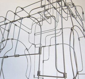 | The Front Room Presents: Rob de Oude Rodger Stevens Rosa Valado March 29th - May 5th, 2013 Reception Friday, March 29th, 7-9 Fri–Sun 1-6 & by appointment The Front Room is proud to present new works by Rob de Oude, Rodger Stevens and Rosa Valado. This exhibition explores the concept of layering and repetition as a means of achieving a unified whole while exploring the sum of its parts. Simple elements weave together to create tapestries of grand design, with limitless functions available to each individual part. Through repetition and meticulous placement, base materials like copper wire and masking tape take on a greater form, creating visual stability while inviting close visual scrutiny. Crisscrossing lines, concentric circles, and repeating forms become their own miniature works, elemental to the final form yet definitive in their own right. Each of the artists in the exhibition use the texture of overlapping linear forms to create a much larger whole. Rob de Oude makes straight lines bend using a complicated and overlapping grid, while Rodger Stevens bent linear sculptural works bring two dimensional linear forms to life in his overwhelming room-sized installation, and Rosa Valado’s architectural table-top configuration confounds and astounds with small, yet massive-seeming wire and metal forms. Rob de Oude’s paintings and drawings are composed of multitudes of meticulously placed and repeated lines to reveal geometric shapes and patterns. The repeated use of a single line displays the infinite possibilities of simple units towards seeking an orchestrated balance in a larger scheme. De Oude’s rigorous painting process consists of layering and weaving matrices of straight lines until, between the contrasting colors and crisscrossing patterns, grids begin to bow and warp. In this exhibition Rodger Stevens’ installation of his linear sculptures create a space of inhabited entities, sometimes recognizable, often not, of shape and form—homages to often under appreciated things around him, they are like Egyptian hieroglyphs of our current times. Inside the space of his installation one feels absorbed and confronted, overwhelmed, by not only the objects around oneself but also by the shadows on the wall within this dense forest of sinewy metal. Rosa Valado’s sculptures are inspired by sacred geometry, physics, and nature. Using a range of metallic light-reflecting materials, Rosa has been creating architectural forms that interact with the viewer, often containing an interior space that one can enter. Rosa, normally known for her massive public sculptures, is working on a smaller “table-top” ratio for this exhibition allowing the viewer to draw oneself inside the architectural installation, like a plan for an unworldly world’s fair unrealized. Front Room Gallery 147 Roebling Street, Brooklyn, NY Hours: Friday-Sunday 1-6pm (and by appointment) | ||||