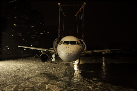 | The Front Room Presents "Brace For Impact: the aftermath of flight 1549" Photographs by Stephen Mallon September 10th-October 18th, 2009 Reception Sat. Sept 12th, 7-10 Viewing hours: Fri-Sun 1-6 and by appointment Artist Talk at the Front Room Gallery: Sunday, October 4th, 4pm "On Jan. 15, 2009, a few Canadian geese with bad timing became snarge, a steely pilot became a hero, and the world became fascinated with images of a jet splashing into the Hudson River and then floating calmly as passengers crowded its wings. But until now, few people have seen the equally surprising pictures of the second half of this story: when a salvage team used the biggest floating crane on the East Coast to pluck the ill-fated Airbus A320 from the frigid water.� Matthew Shechmeister, �Wired Magazine� Front Room Gallery is pleased to present Stephen Mallon's "Brace For Impact: the aftermath of flight 1549.� It is very difficult to encapsulate the events that happened during and following the crash of flight 1549, but Stephen Mallon's large-scale photographs, taken during the salvage of the fuselage and engine, impart a physicality and scale to these incomprehensible occurrences. Mallon's photos present us with the aftermath of this disaster and remind us how it was averted despite nearly unbeatable odds through the mastery and bravery of the pilot and crew. Never before has a commercial aircraft crashed in the Hudson with the complete survival of all passengers and crew. They were rescued by the Circle Line sightseeing cruise ferry (along with other rescuers) almost instantly. Men, women and children waited their turns patiently standing on the wings of the plane, half-submerged in the icy water on what felt like the coldest day of the year. This feat is a testament to the bravery of the crew and passengers. As the fuselage and engine of the aircraft were later brought up intact by a gigantic crane and a team of divers in heated wetsuits, Stephen Mallon captured the moment standing on the deck of the crane-barge. In Mallon's uncanny photographs the plane sometimes appears to be a metaphorical wounded animal, like a whale lifted completely out of the water. It is damaged, beat up and missing one of its engines, but it nevertheless survives. The divers, in their heated wetsuits with huge face-gear, seem like astronauts floating through an icy void in space. And, we finally get a glimpse of the famous engine�disabled by some unfortunate Canadian geese�in a stunning pseudo-portrait by Stephen Mallon as it is lifted from some eighty feet of icy water. The Front Room Banner Project returns The Front Room launched the Banner Project in the fall of 2001. Since then dozens of local and emerging artists have been commissioned to create a banner or installation outside the gallery. After a brief hiatus the Banner Project returns this fall with a project conceived by the London design team of Kevin Green, Frances Reynolds and Ned Scott. Their project, entitled "Grow Your Own Banner", is an elegant amalgam of long-distance planning and local growth. "Grow Your Own Banner" will be on view outside the gallery from September to December 2009. For more information about the Front Room Banner Project please visit: http://www.frontroom.org/banner.htm The Front Room is at 147 Roebling St. For more information please contact: Daniel Aycock (718) 782-2556 [email protected] | ||||