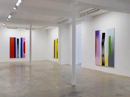 | Alain Séchas Dec. 1, 2012 - Jan. 19, 2013 Alain Séchas last showed his work at Galerie Chantal Crousel in 2009, startling us with a set of acrylics on papier marouflé (paper mounted on canvas), interlacing colors, curves, and splatters. The titles he gave to the paintings compelled the viewer to seek out analogies, thereby establishing a dialogue between the viewer and the piece. The following year, the artist began working with oil directly on canvas, purifying his forms and intensifying the colors. A group of untitled, numbered paintings were shown at the Consortium in Dijon in 2011. These works with a curve or curl in the foreground, structuring the canvas, standing out from a highly reworked background, delicately tinted in one or several shades, imparting an overwhelming impression of lightness and freedom. At his current show at Galerie Chantal Crousel, Alain Séchas presents a selection of recent works: large oils on canvas as well as smaller oils and pastels on paper. The colors are frank, directly squeezed from the tube. A firm black line – a central, vertical statement – dominates the composition. This brush stroke is no longer set off from the background, but integrated into the painting. On the periphery of the canvas, a new, elliptical element suggests a way out, an opening onto the space.The oils and pastels on paper, hanging in the gallery wings, adopt the same approach. Each piece offers a fully formed, autonomous universe. Is the artist putting his past behind him? No, the continuity is undeniable. True, Alain Séchas is expressing himself differently, with different forms, but the new works are an outgrowth of his earlier, figurative paintings. The only thing missing is figuration. The same untrammeled movement, the same pleasure in painting come through. In his use of color, Séchas delights in astonishing our senses, in sharpening our awareness. “Just as I took possession of the lithe, mute-faced cat-men and of flirtatious Martian women, whose spiraling movements I arrested in a comical or moving way, I am taking possession of vertical canvas stretchers, oil paints, brushes, and strokes.” (From an interview with Alain Séchas published in the journal Association Cause Freudienne, 2012) Alain Séchas lives and works in Paris. Several public collections own works by Séchas, including the MAMCO in Geneva; the MAC/VAL in Vitry-sur-Seine; and the Centre Georges Pompidou and Centre National des Arts Plastiques in Paris. Recently, both the city of Nantes and the Palais de Tokyo in Paris hosted Séchas’s Sans cimaise et sans pantalon project, for which he was given permission to select works from the collection of the Nantes Museum of Fine Arts, providing new insights. Other recent shows include: Extra Large, Monumental works from the collection of Centre Pompidou, Grimaldi Forum Monaco (2012); The Deer A show by Éric Troncy, Le Consortium, Dijon, France (2012); Platée, Fiac - Hors les murs, Jardin des Plantes, Paris, France (2011); Marouflette, MAMCO, Genève, Suisse (2009); Rêve Brisé, Musée Bourdelle, Paris, France (2008); Nuit et jour, Forum Hermès, Tokyo, Japon (2008); Les Grands fumeurs, MAC / VAL, Vitry-sur-Seine, France (2007). | ||||