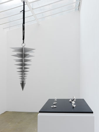 | English below Fabrice Gygi 12 septembre - 24 octobre 2009 En r�serve Les oeuvres de Fabrice Gygi n�ob�issent pas � un r�gime performatif et ne sont pas destin�es � des applications fonctionnelles : et pourtant, et comme signes et comme objets techniques, elles entretiennent de fortes relations d�implication � l�action et � l�utilisation. Les travaux expos�s dans cette exposition pourront ainsi �tre rattach�s � trois classes : les bijoux, les machines (Fliessband et Star System) et les signaux (Strap-paints). En tant qu��l�ments relevant de ces trois classes, les relations � singuli�res � que ces oeuvres entretiennent � l�activit� et � la fonctionnalit� s�op�rent selon un mode soustractif, dans une mani�re de mettre (action et fonction) en r�serve. Les objets, dans un sens auquel il faut accorder sa pleine litt�ralit�, sont �expos�s � : les machines ne marcheront pas ; les bijoux ne seront pas port�s et les signaux resteront align�s au mur : ce qui les classe en tant qu�oeuvres, accordant le primat au visible, les d�classe donc en tant que choses usuelles. Mais on ne saurait se contenter de ce lieu commun � objets d�arts inactifs, anim�s par le seul regard �, car avec ce d�classement se r�alise pleinement la mise en fonction et la mise en action des objets con�us par Fabrice Gygi selon un mode potentiel. Si Fliessband et Star System, machines qui comportent des tapis roulants et des lames tranchantes en �toiles mont�es sur des axes rotatifs � et dont les fragments peuvent �tre assembl�s, s�par�s ou r�unis, mont�s ou d�mont�s � ne disposent pas de fonction mat�rielle r�elle, on devra surtout souligner qu�elles n�ont pas � en avoir une, pr�cis�ment. Leur puissance virtuelle, qui ne s�inscrit dans aucune limite tangible, est li�e � leurs utilisations et � leurs configurations potentielles. Il en va de m�me pour les Strap-paints, dont la facture renvoie autant � la rigueur des r�alisations conceptuelles qu�au panneau signal�tique g�n�rique, ou des bijoux, dont les formes semblent vouloir contraindre certains corps mais aussi pouvoir en meurtrir d�autres. La mise en action de ces objets, dans sa mise en r�serve, est � l�origine de cet �trange �tat de latence et de tension qui les caract�rise, et leur permet d��changer leurs propri�t�s pour finalement rejouer les classes qui les contraignent. Les machines Fliessband et Star System adressent certainement un signal terrifiant (acheminement, broyage et d�coupage des mati�res ou des corps), mais elles se pr�sentent aussi, silencieuses, comme un joyau rutilant. Les bijoux sont des signes aux lignes singuli�res dont les formes renvoient � celles d�objets techniques �trangement fa�onn�s (des sortes de d�s � coudre, de poin�ons et de poings am�ricains�). Aux rails en aluminium qui dessinent le signal des Strap-paints on pourrait accrocher ou arrimer des �tres et des choses : ils tracent aussi en trois droites parall�les les marques d�un blason se d�tachant sur fond rouge� En cela, si tous les objets con�us par l�artiste font signe et s�adressent au spectateur en combinant, selon, les qualit�s du technique et du symbolique (voire de l�all�gorique), de l�artisanal et de l�industriel, du concret et de l�abstrait, du f�tiche et du trivial� dans le suspens de leur activation et dans la potentialisation de leurs fonctions, ils lib�rent des affects de s�duction et de menace, qui viennent finalement semer le trouble dans les cat�gories morales de l�ordre et du d�sordre. Sans ambigu�t�, dans l�ambivalence. Christophe Kihm Fabrice Gygi September 12 - October 24, 2009 In reserve Fabrice Gygi�s works do not comply with a performative scheme and are not destined for functional application. However, as both signs and technical objects, they maintain strong relations to implications of action and use. The works presented in this exhibition can thus be related to three categories: jewels, machines (Fliessband and Star System) and signs (Strap-paints). As elements of these three categories, the singular relation these works maintain to activity and functionality are facilitated by a subtractive method, by way of putting (action and function) in reserve. Objects, in the sense to which its full literality should be attached, are �exhibited�: the machines will not work, the jewels will not be worn and the signs will remain lined up on the wall: what classifies them as works of art by giving primacy to the visual, declassifies them as everyday things. However, one cannot gratify oneself with this commonplace � inactive art objects, animated solely by the eye of the beholder � since it is through this declassification that the objects Fabrice Gygi has devised fully achieve their function and are put into action in a potential mode. If Fliessband and Star System, machines consisting of conveyor belts and radial cutting blades mounted on rotating axes � whose fragments can be assembled, separated or combined, mounted or dismantled � do not have a real material function, it should be emphasised that they need not have one. Their virtual power, which does not fall within any tangible boundary, is related to their uses and their potential configurations. The same applies for Strap-paints whose rendering refers as much to the rigour of conceptual creations as to a generic signboard, and for the jewels whose shapes seem to want to constrain certain bodies but also seem able to bruise others. The putting into action of these objects, by setting them in reserve, is at the origin of this strange state of latency and tension which distinguishes them and allows them to exchange their properties so that ultimately they might reenter into play with the categories which constrain them. The Fliessband and Star System machines 