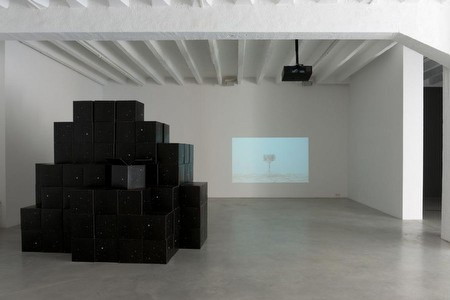 | ALEXANDER GUTKE April 28 - June 16, 2012 On the occasion of Gallery Weekend Berlin 2012 Galerija Gregor Podnar is pleased to announce its second solo exhibition of Alexander Gutke in Berlin. Alexander Gutke will show new and recent works that continue his on-going investigation into a whole host of issues, ranging from narrative self-reflexivity, analog apparatuses, measurement, and perhaps what can be best described as a metaphysical existentialism. The exhibition features a 16 mm film installation, a video, a sculptural installation, a wall sculpture, and a series of photographs. Auto-scope (2012) is a 16 mm film that depicts a looped voyage inside a projector and outside into an open, snowy landscape. The video 1-2-3-4 (2010) portrays a sporadic cascade of drum sticks falling onto a snare drum with no apparent rhyme or reason. The sculptural installation Folded into One (2012) consists of a couple of hundred of stacked boxes covered both on the inside and the outside with imagery of the universe, as if space were somehow modular and looped. The theme of the loop continues in the wall sculpture Measure (2011). This work is comprised of a brass Moebius strip, laser engraved with millimeter markings in the spirit of a flexible tape measure. 9 to 5, Stormgatan 4 (2012) is a series of digital photographic ink jet prints, which see the artist photographing the same spot on a wall throughout the course of a day, placing the resulting photograph on the wall and systematically replacing each subsequent image with a new one, such that the resultant photograph becomes a diary of the artist in his studio. | ||||