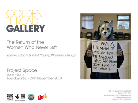 | The Return of The Women Who Never Left Zoe Murdoch & YEHA Young Womens Group The Return of the Women Who Never Left explores the ways that young women in Ardoyne are judged and stereotyped and works out ways to challenge this by using photography and humour. Zoe Murdoch (artist) worked closely with the YEHA project and a core group of 11 young women to find creative ways of changing people�s perceptions of young women from Ardoyne. Many topics were addressed in depth including teenage pregnancy, drug & alcohol abuse and different perceptions of what beauty is. The young women soon discovered that messages can be made more powerful by using humour and irony as an antidote to the, often cruel, stereotypes and clich�s that are directed towards young people in general and young women from Ardoyne in particular. Young people from working class areas are very often the victims of class and gender stereotyping. Projects like The Return of the Women Who Never Left give the young women an opportunity to redefine themselves as multi-dimensional, unpredictable and untypical girls! Ruth Graham Development Officer Golden Thread Gallery The YEHA project is based in Ardoyne Flax Healthcare centre. It works under the umbrella project of Ardoyne and Shankill Healthcare Partnership. We are a small team of highly skilled youth workers working with young people aged between 0-25 on a range of issues with the goal of enhancing their personal development. The project worked with a group of young women aged between 13 -16 all from Ardoyne. The girls decided that they would like to cover the issue of �stereotypes` as they often suffer from generalisations that others can make about young girls from the Ardoyne area. Ardoyne is a highly deprived area with a strong sense of political and national identity. We asked the girls to explore their own identity and how coming from this community has affected them. The girls are were highly motivated over the twelve week project and lead the majority of discussions and activities themselves themselves. We offered them a range of mediums to use throughout the project. They chose to work with Zoe an artist from the Golden Thread gallery to carry out a photography project. Sick of being perceived as `animals` the girls used the photgraphs as a way to express this. I am extremely proud to have worked with this group of young women and wish them every success in the future. They achieved an awesome amount of perspective from working together and a good understanding of who they are and what they desire to become. Lara Thompson Youth Worker YEHA Project About the Gallery From its beginnings, in 1998, in a former linen mill on a contested �peace line� in North Belfast, Golden Thread Gallery has delivered annual programmes of exhibitions and activities designed to make a real contribution to the visual arts and wider communities in Northern Ireland. Now located in Belfast�s developing �sailor-town� area, on the edge of the city centre, Golden Thread Gallery has grown a unique position in the region by simultaneously developing programs of contemporary art that reach local and international audiences. Golden Thread Gallery has no permanent collection. Providing instead an ongoing series of temporary exhibitions and activities, that provide accessible and thought provoking opportunities to engage with aspects of contemporary artistic practice. We pride ourselves on offering a friendly, open space where everyone is welcome. For those who have never visited the Golden Thread Gallery before, why not pay us a visit and get a taste for what we do. For further information about our program and projects visit our website www.goldenthreadgallery.co.uk or e-mail: [email protected], or why not join us on Facebook or Twitter, we love new friends. The Golden Thread Gallery is a company Limited by Guarantee NI 41642 and is accepted as a Charity by the Inland Revenue under reference XR 54731. Opening Hours: Tuesday - Friday 10.30am - 5.30 pm & Saturday - 10.30am - 4pm. Contact Details: 84-94 Great Patrick Street, Belfast, BT1 2LU. 0044 (0) 28 90330920 | ||||