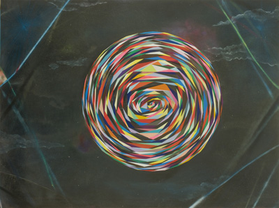 In Duncan�s paintings and drawings, abstract patterns, spirals and vaporous forms float within vast indeterminate, galaxy-like spaces. In the painting A New Way to Cope, a large multi-colored spiral, composed of primary colors in compressed angular shapes, spins and swirls in a blackened space. Rays of light in different hues surround this kaleidoscope shape, while thin clouds float and drift nearby. The darkness goes to the edge of the painting, while each side of the work is painted in a bright color, causing a slight outward glow.