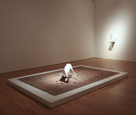 Also on view in the main gallery is Untitled (2001), a large-scale piece first shown in the Whitney Biennial in 2004, in which a young buck standing in the middle of a faux Persian rug is struggling and tearing away at the rug with his antlers. This bizarre scene sets off the contrast between this young animal's primal instincts to shed the velveteen covering from his maturing antlers with the well-ordered sophistication of the rug's intricate patterns. This work frames the tension between the wild and the tamed, the innate and the cultivated, while it highlights the perversity of culture's attempts to control natural instincts.