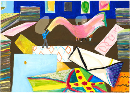 A new series of paintings and works on paper depicts a family in a carpet shop, each carpet a miniature abstract painting made vividly, and accurately, peculiar. Combining a sharp eye for situational humour with formal explorations of colour and shape, McDonald has developed an individual and idiosyncratic iconography that celebrates the human condition.