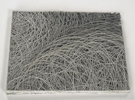 With organic and sweeping movements, Fowler's drawings begin as curving, looping lines penciled across the page; and with marks laid down, the drawings begin their transformation. Fowler uses an X-Acto knife to meticulously remove the negative space from each piece, creating a delicate paper lace of graphite lines. With drawings stacked upon each other, Fowler's art takes form. The layers and layers of beautifully penciled, overlapping latticework are as delicate and entrancing as a spider's web. Ranging from three sheets to sixty-four sheets in thickness, Fowler's artwork takes on new dimension, reflected in the complex and changing interplay between dark graphite markings and shadowy background. Pushing the boundaries of the medium, Fowler's cut paper drawings engage and examine the intersection of drawing and sculpture.