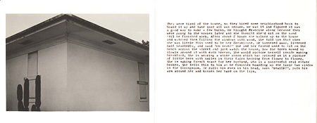 In these stark early works, Kruger places a single image alongside a panel of text. The photographs, shot by Kruger in California and Florida, depict from a passer-by�s viewpoint unremarkable details � windows, corners, gables, roof overhangs � of residential architecture. The occasional intrusion of a palm or other tropical vegetation provides the only sense of place. Equally detached in its casual typewritten appearance and tone is the accompanying text: Kruger has written a narrative which recounts the incidental urgencies and activities of the buildings� imagined inhabitants. The �Picture/Readings� posit that by looking (the province of photography) richly varied internal spaces may be revealed.